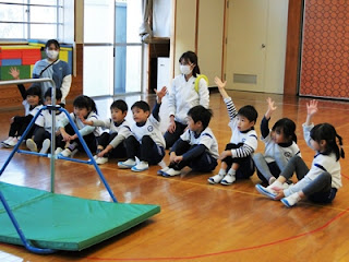 幼稚園が「染め物遊び」に、なかよし学級の子どもたちを招待してくれました。初めに挨拶や自己紹介をしたあと、グループに分かれ、輪ゴムやガチャガチャのケース、ペットボトルのふたなどを使って、ハンカチに模様ができるようにしました。それができると、幼稚園で集めた玉ねぎの皮を煮た染め液に入れました。染め上がるまでしばらく時間があったので、一緒に鬼ごっこやブロック遊びをしました。20分後、ハンカチを取り出しミョウバンにつけたところで、なかよし学級の子どもたちは小学校に帰る時間になってしまいました。